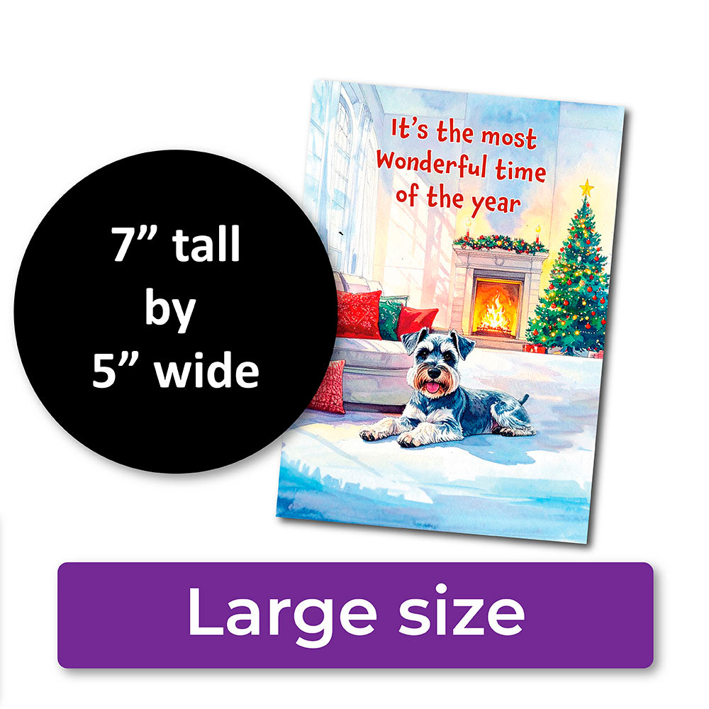 Front: A cheerful scene of a schnauzer lounging by the fire, surrounded by festive pillows and a sparkling Christmas tree. Message reads “It’s the most Wonderful time of the year”.