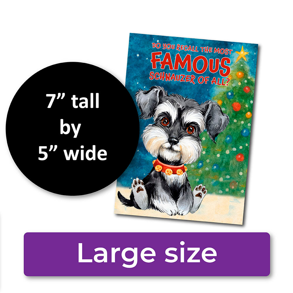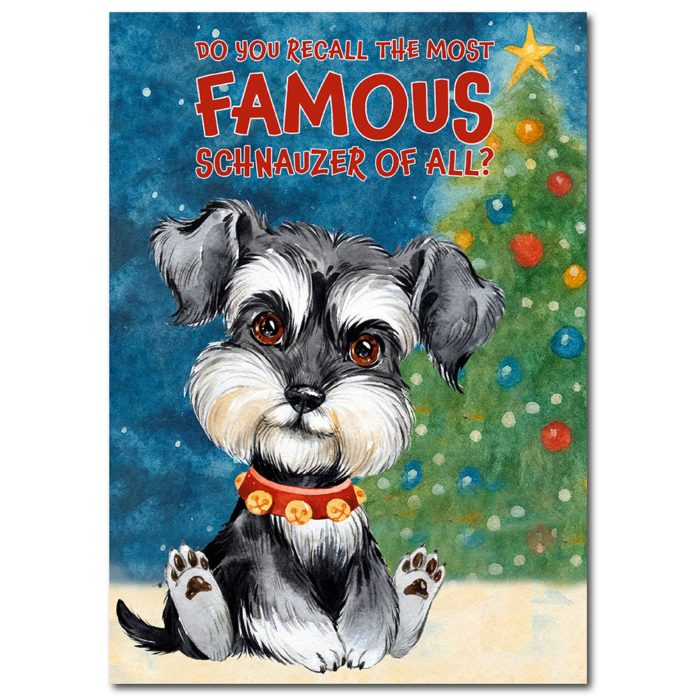“Do you recall the most famous schnauzer of all?” Featuring an adorable hand-illustrated miniature schnauzer in front of a festive Christmas tree. -