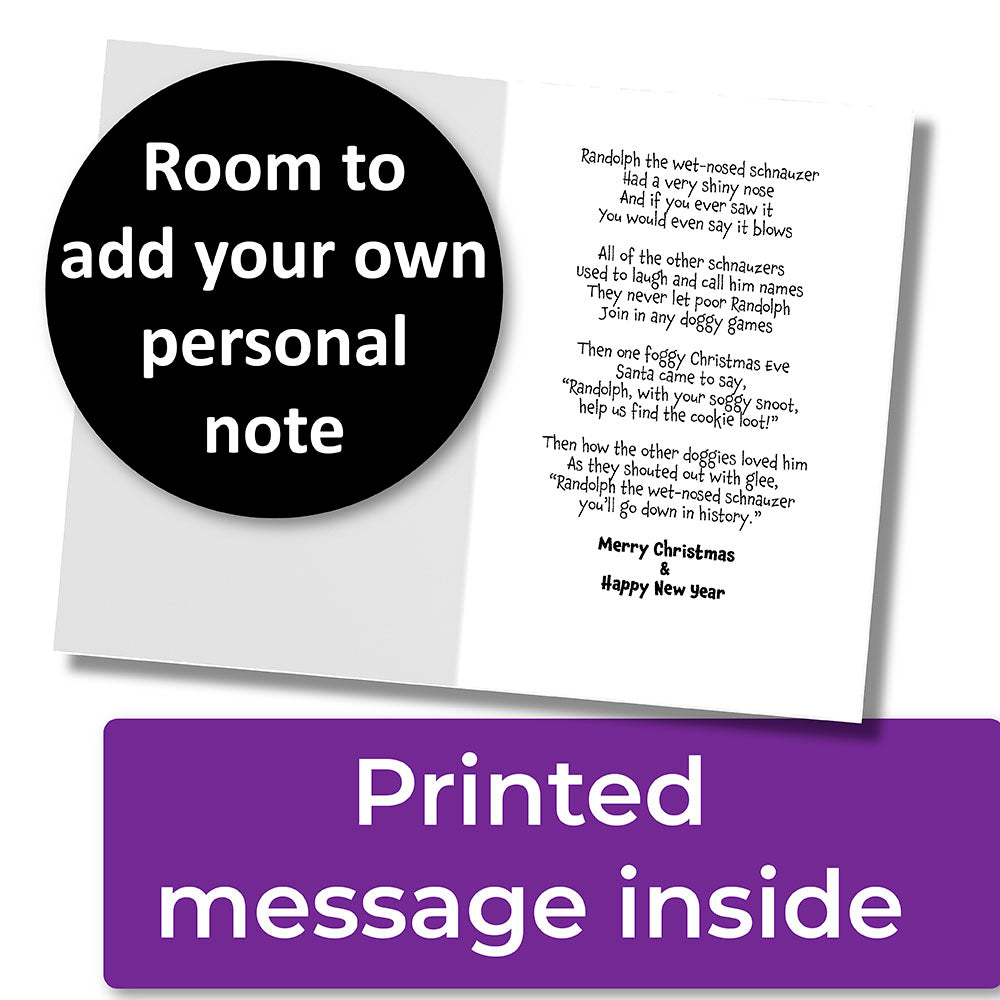 Meet Randolph the Wet-Nosed Schnauzer — a playful twist on a holiday classic that’s sure to bring smiles (and maybe a few happy tail wags)! Perfect for schnauzer lovers and dog enthusiasts alike, this card combines holiday cheer with heartwarming humor. -